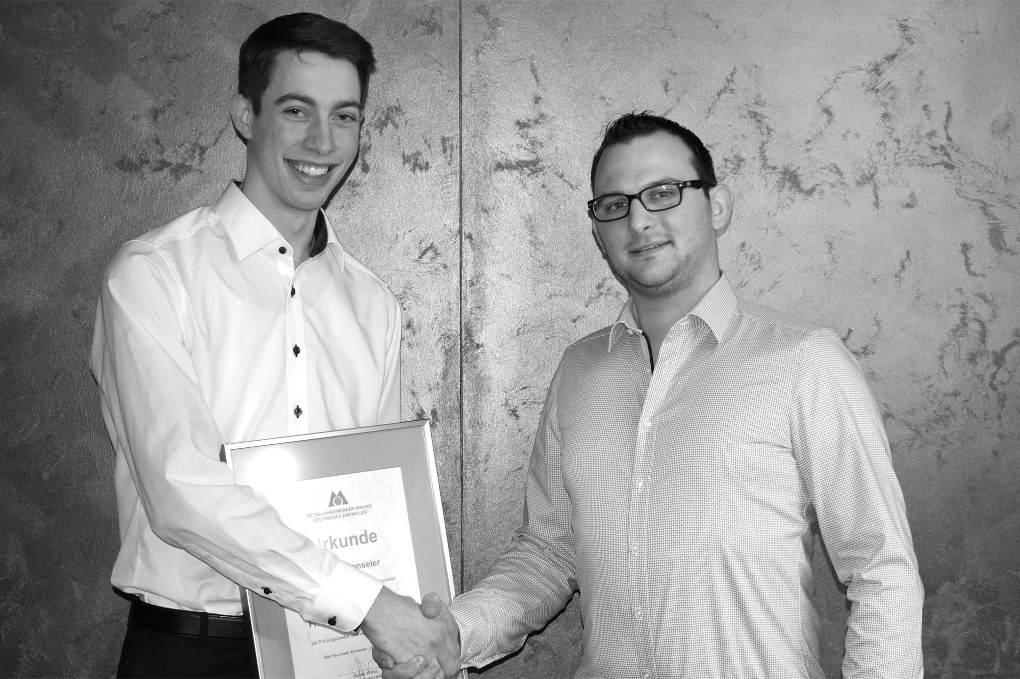 Nach nur zweieinhalbjähriger Ausbildungszeit in unserem Betrieb hat Tobias Henseler seine Prüfung 2019 als Innungsbester abgeschlossen. Wir freuen uns über diese hervorragende Leistung! Als Werkstudent bleibt Tobias unserem Team weiterhin erhalten. Im Bild unser Innungssieger mit seinem Ausbilder Martin Blechschmidt.