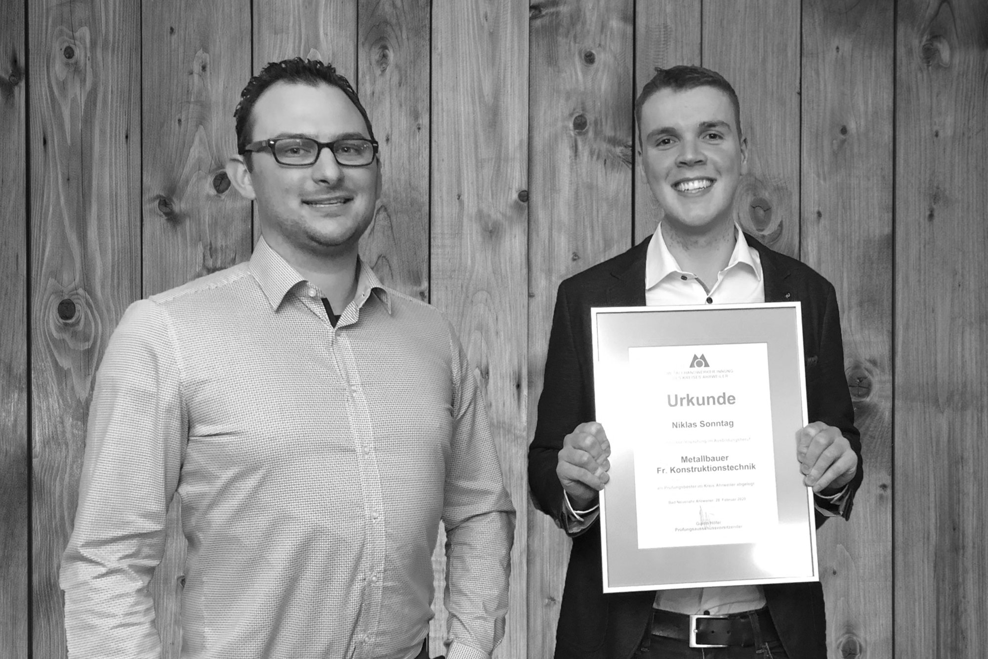 Niklas Sonntag hat es ebenfalls geschafft – er wurde Innungssieger der Metallbauer 2020! Ein echter Steel Buddy aus Leidenschaft, der sich nach nur einem Jahr bereits den Meistertitel geholt hat! Im Bild Martin Blechschmidt mit unserem Innungsbesten Niklas Sonntag.