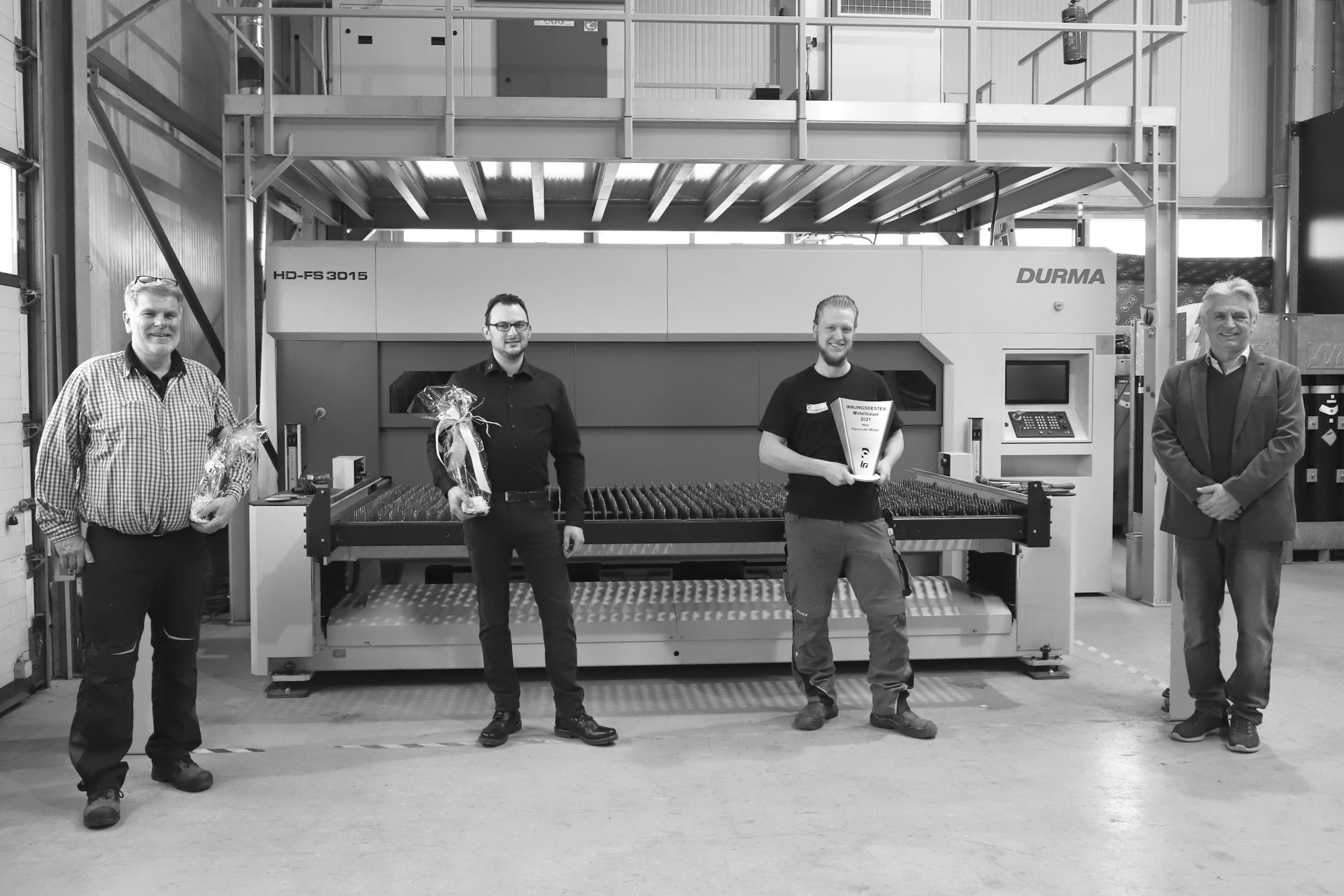Alexander Müller holte sich 2021 den Titel des Innungsbesten Metallbauers Fachrichtung Konstruktionstechnik. Insbesondere das letzte Ausbildungsjahr war für die Prüflinge pandemiebedingt durch die einschränkenden Maßnahmen in der Betriebs- und Schulorganisation geprägt und damit eine zusätzliche Herausforderung. Aber Alexander Müller war „eisern“ genug, sich den Titel des Innungsbesten zu holen. Im Bild: Prüfungsobermeister Alfons Wolber; Ausbilder, stellv. Betriebsleiter Martin Blechschmidt, Neugeselle Alexander Müller, Geschäftsführer Bertold Schäfer.